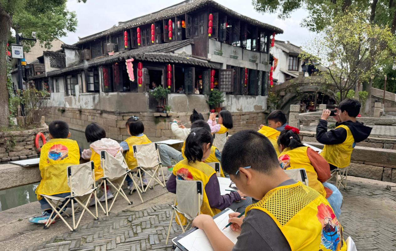 午间休息后,到了古镇写生环节。在专业美术老师的指导下,孩子们化身小小创作家,在古镇一隅支起画板,或坐或立,用稚嫩却充满灵性的笔触,将眼前的古镇风光、人文风情一一呈现于画布之上。
