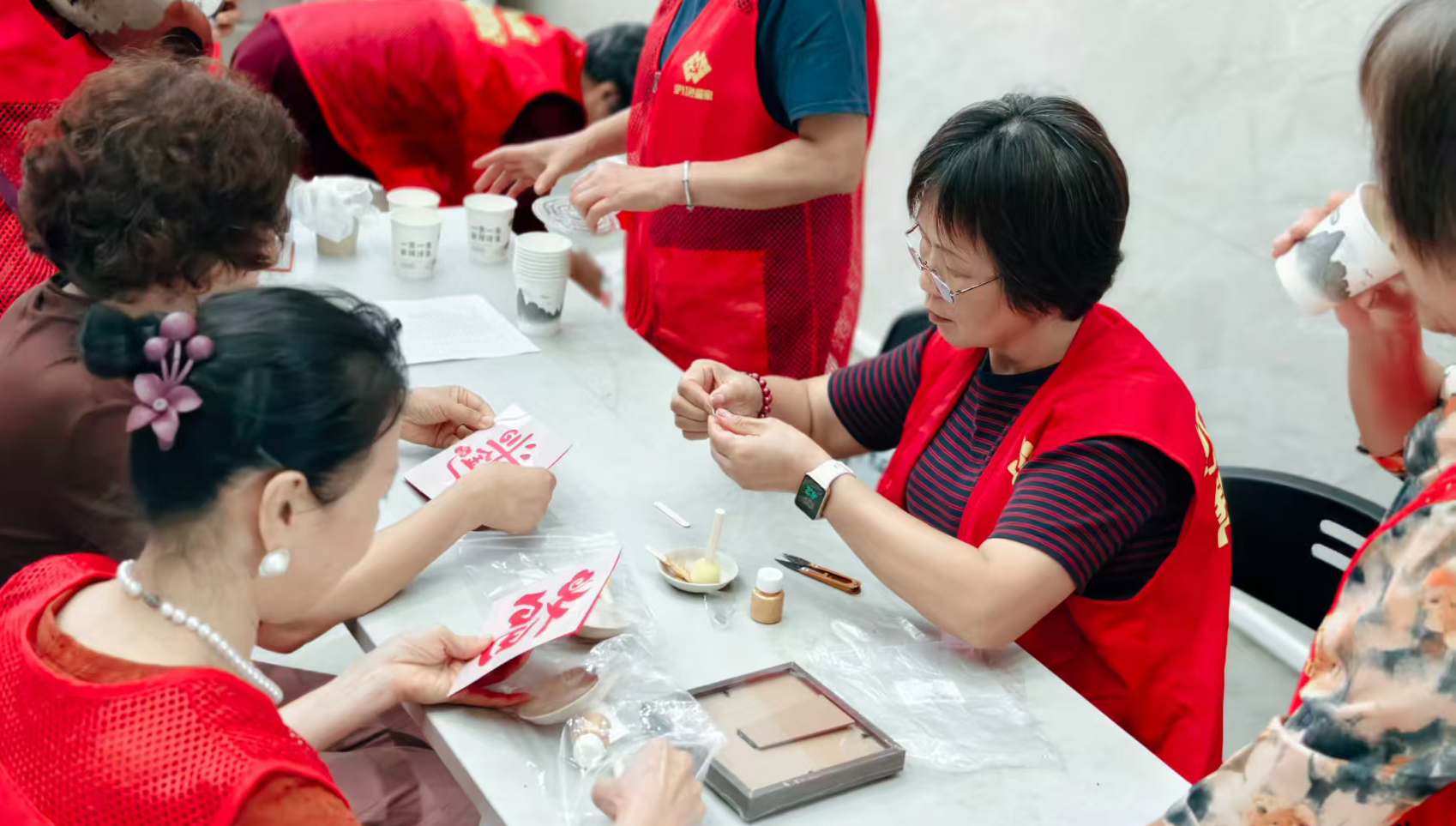 市集现场热闹非凡,处处洋溢着温馨祥和的氛围。在手工拓印体验区,志愿者陈云老师耐心讲解拓印技巧,手把手指导老人将红色颜料均匀涂抹在模板上,再覆上宣纸轻轻按压。老人专注地操作着,当一幅幅印有“福”字、菊花图案的作品完成时,脸上绽放出孩童般的笑容。80岁的丰奶奶举着自己的拓印作品高兴地说:“这辈子没玩过这个,今天不仅学会了新技能,还把‘福气’带回家,太有意义了!”