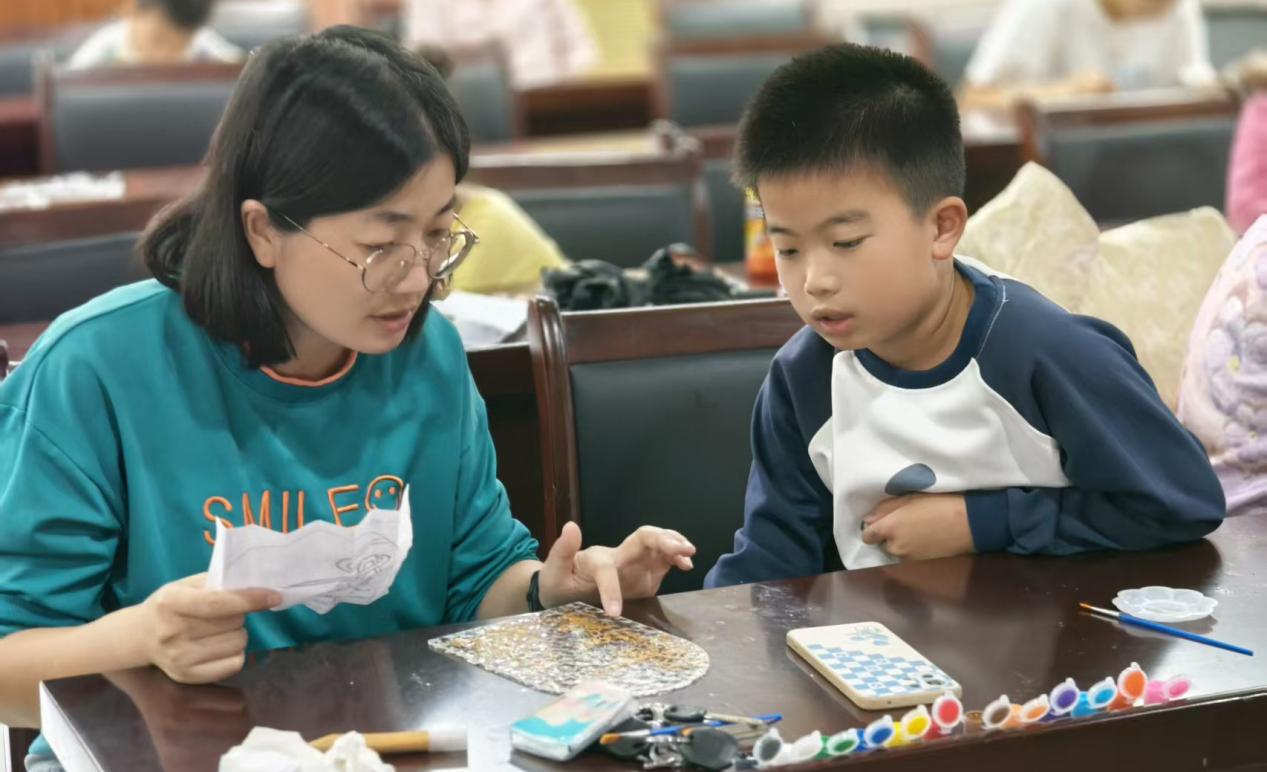 在手工制作环节,孩子在家长的陪伴与协助下,兴致勃勃地开始创作。他们小心翼翼地拿起画笔,在玻璃片上勾勒出菊花、登高、祥云等富有重阳节庆元素的图案,或发挥想象自由创作。家长则在一旁耐心指导,共同调配色彩,填充描绘。