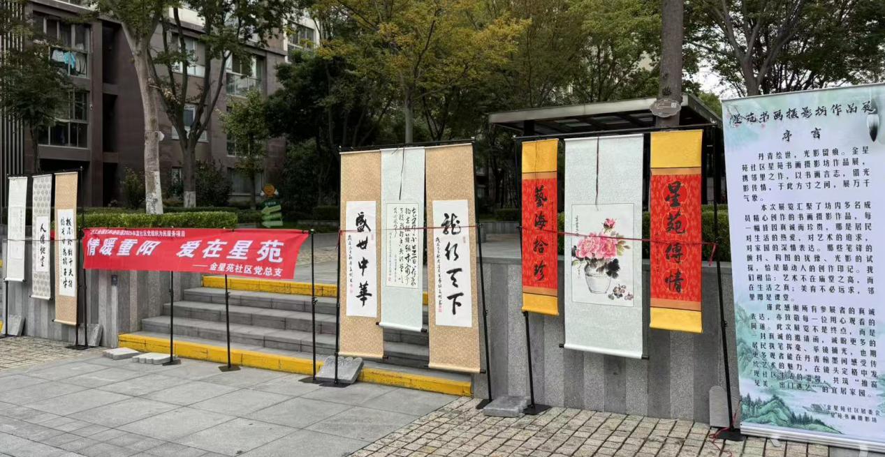 10月18日,便民服务活动现场一角,“星苑书画摄影坊”举办的社区书画作品展同步亮相。该书画摄影坊成立于今年4月,在金星苑社区党总支和“乐龄先锋”志愿服务队的推动下,逐步实现从兴趣团体到规范组织的转型,由三位老党员担任主理人,负责日常运营与活动策划。