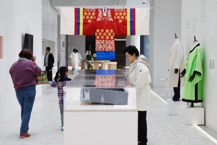 此次展览分为“色·才”、“形·样”两个部分,集中展示57件来自中国和韩国的服饰艺术作品,既有当代工艺大师参照传统服饰进行制作的服饰作品,也有依托传统服饰元素进行再创作的绘画、装置、多媒体等各类艺术品,都力图通过服饰艺术建立传统与当下、过去与未来的新链接,构筑中韩两国文化交流的新起点。