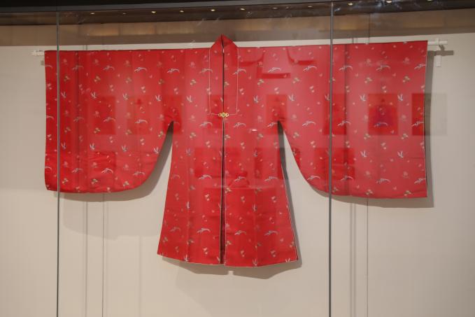 其中,展品红地雀鸟散花宋锦披风,其衣长132厘米,通袖长224厘米,袖宽85厘米,此件披风以孔子博物馆藏“明·桃红纱地彩绣花鸟纹披风”为灵感创制而成。形制为直领,对襟,阔袖,左右开衩,遍身散点花鸟图案,融入宋锦几何纹的典型风格特点,配以回纹地,进行纹样再设计,在穿梭间细腻勾勒出四季更迭中的花卉盛放与雀鸟欢歌。