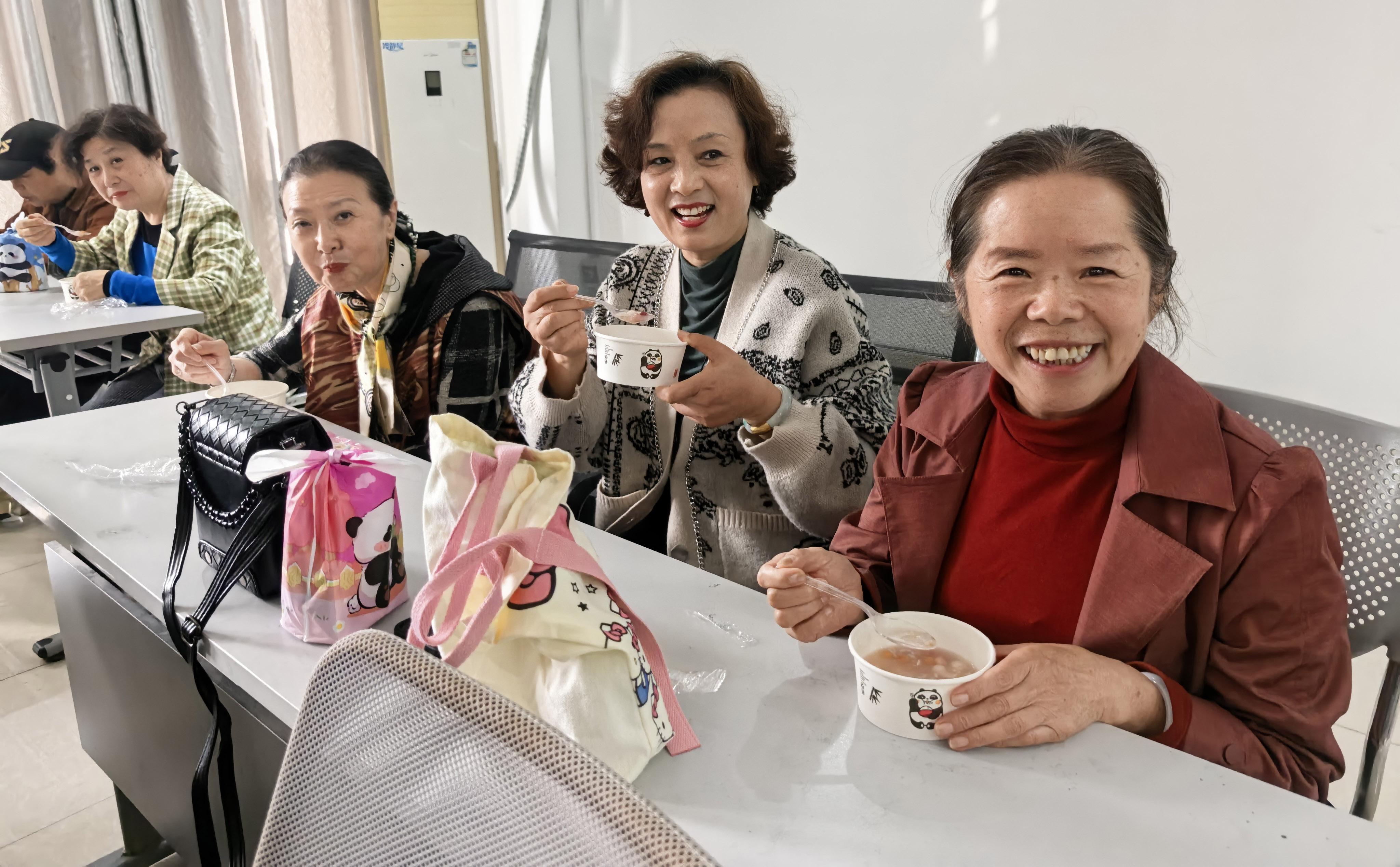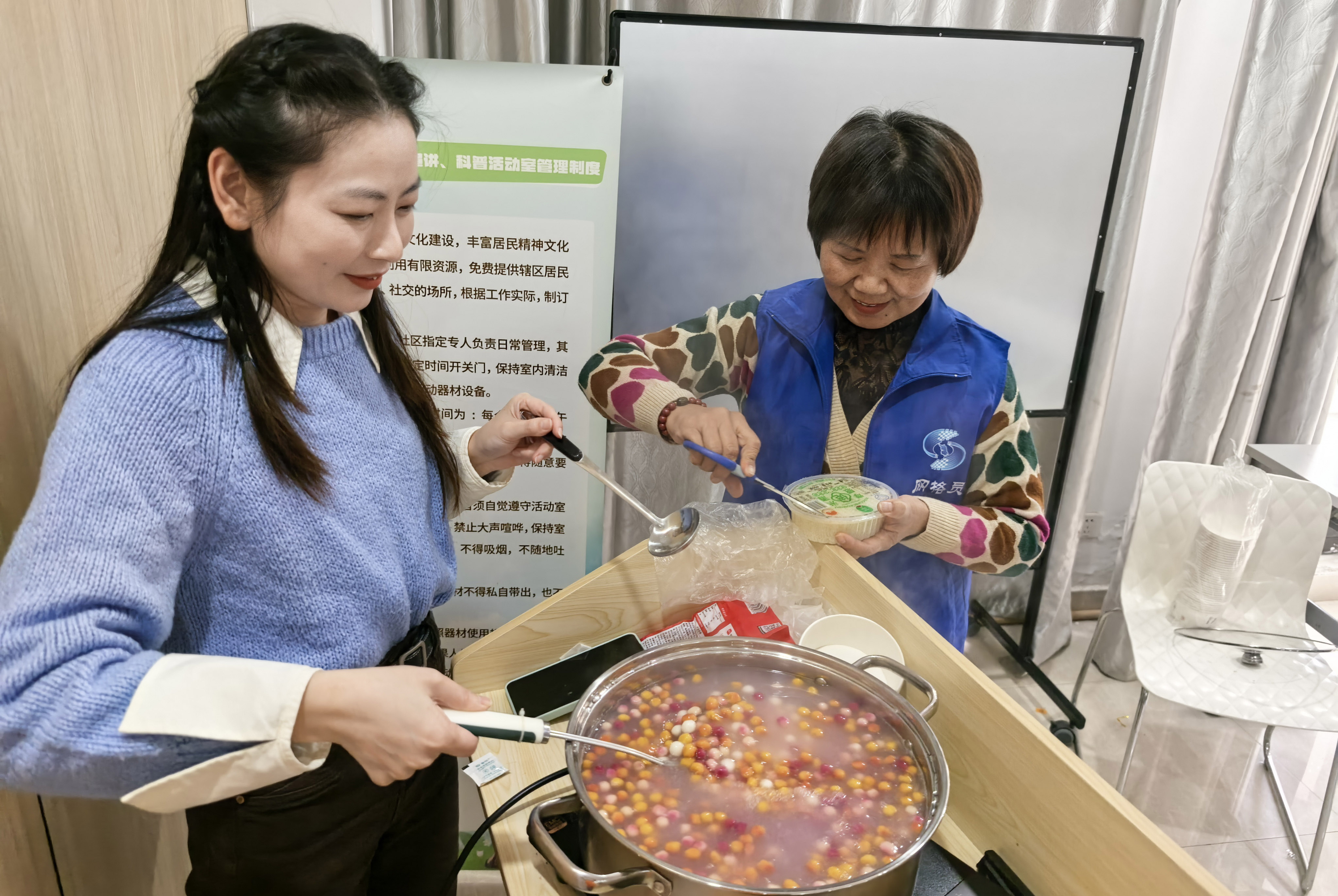 在制作芋圆过程中,大家围坐在一起,聊聊家常、分享立冬习俗。工作人员还为老人讲解立冬养生知识,提醒大家注意保暖、合理饮食。“冬天天气冷,多吃点温热的食物对身体好,今天咱们做的芋圆就很合适,软糯香甜又养胃。”志愿者张玉娟一边帮老人调整芋圆大小,一边耐心地讲解着。不一会,一个个饱满圆润的芋圆就摆满了托盘。下锅煮熟后,淋上香甜的红糖汁,一碗碗热气腾腾的芋圆端到大家面前……老人细细品尝着,暖意在口中化开,更在心里流淌。