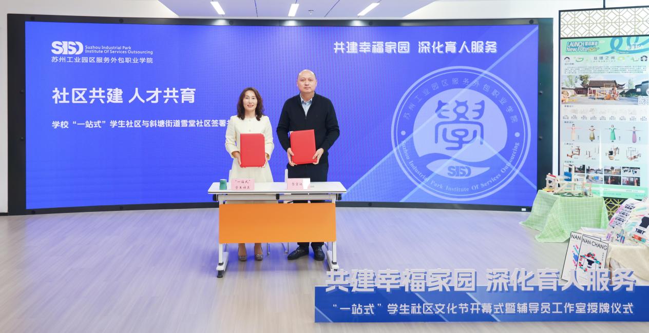 江南时报讯 为深化“一站式”学生社区育人功能,构建校社协同新格局,11月5日,“共建幸福家园 深化育人服务”——“一站式”学生社区文化节开幕式暨辅导员工作室授牌仪式在苏州工业园区服务外包职业学院(下面简称“苏外包学院”)举行。斜塘街道雪堂社区受邀出席,并作为重要合作伙伴全方位深度参与,积极推动社区服务与高校育人工作同向而行。