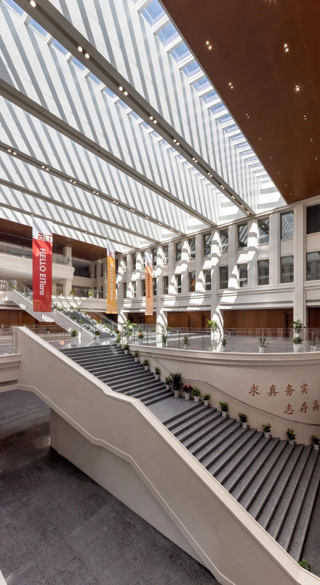 庄重与典雅;玻璃幕墙则赋予了建筑现代感与通透性,既延续了传统园林的意境,又兼顾了校园建筑对功能性的需求。