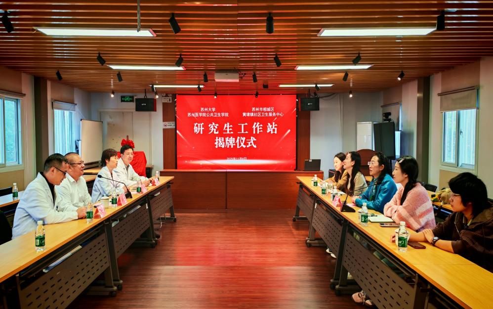 江南时报讯 近日,苏州大学苏州医学院公共卫生学院与相城区黄埭镇社区卫生服务中心共建的“研究生工作站”正式揭牌!相城区医学会秘书长孙雪龙、苏州大学苏州医学院公共卫生学院副主任马亚娜、黄埭镇社区卫生服务中心领导班子及研究生代表出席活动。