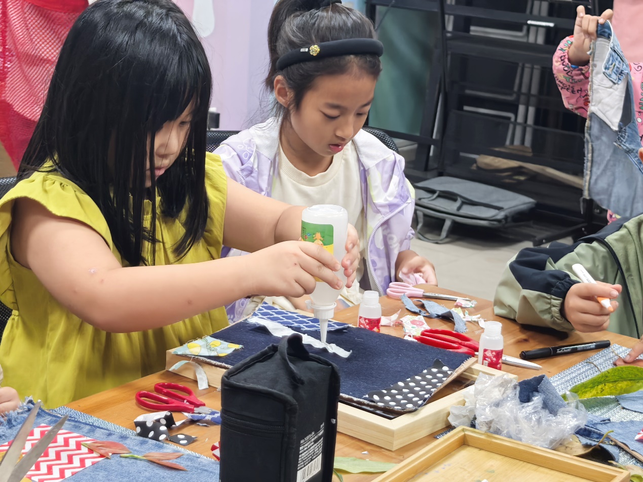 “布与自然”生态艺术拼贴现场,废旧牛仔布与秋日落叶成为创作主角。居民们有的用蓝色牛仔布剪出蜿蜒溪流,以银杏叶作游鱼,拼出“秋天的河流”;有的将各色布块拼接成底色,点缀红枫叶片,勾勒出诗意画卷。“以前觉得旧衣服没用,现在才知道是放错地方的资源。”参与活动的张阿姨拿着作品感慨道。这场手工创作不仅赋予旧物新生,更让居民在动手实践中理解“循环利用”的深刻内涵,将环保理念转化为审美实践。