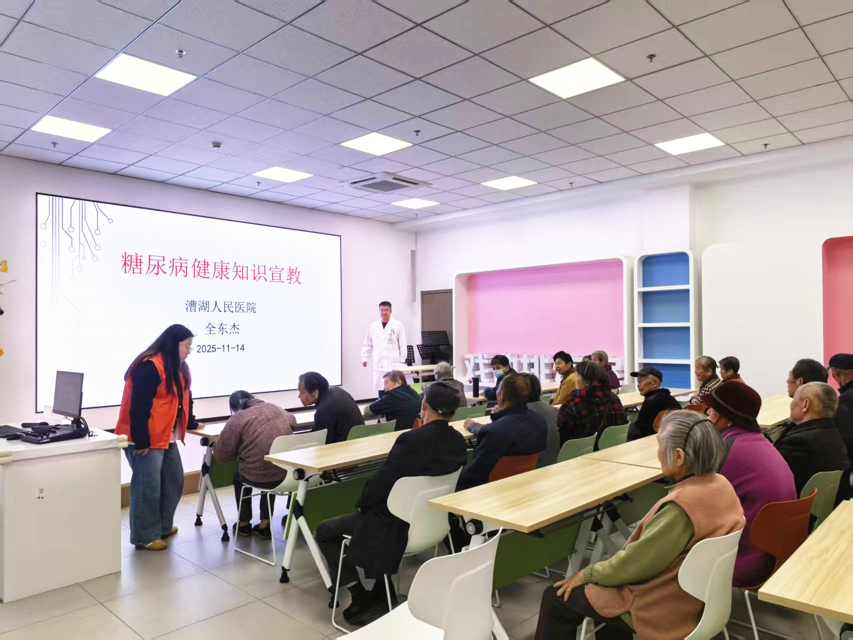 江南时报讯 11月14日联合国糖尿病日当天下午,苏州市相城区漕湖人民医院组织医务人员走进水岸佳境日间照料中心,开展以“糖尿病与幸福感”为主题的健康服务活动,倡导“提高认知,重在行动,关注职场糖尿病”,将专业医疗服务送到居民身边。