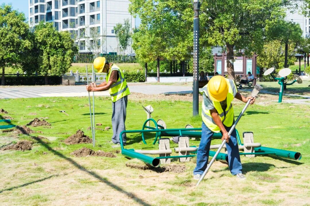 同一时间,森泽园休闲绿地上,老旧健身器材更换工程也在热火朝天地推进。几名工人分工协作,挖坑定位、安装加固,已初步完成扭腰器、漫步机等主体框架的搭建,崭新器材在阳光下格外醒目。