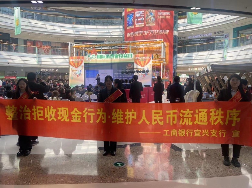 江南时报讯 随着电子支付的发展,现金收付环境发生重大变化。为贯彻落实人民银行关于整治拒收现金工作要求,维护人民币的法定地位,创造良好的人民币流通环境,进一步做好金融消费者教育和金融知识普及工作,2024年3月15日,在国际消费者权益日到来之际,工行无锡宜兴支行积极组织在宜兴万达广场开展“整治拒收现金行为 维护人民币流通秩序”主题宣传活动。