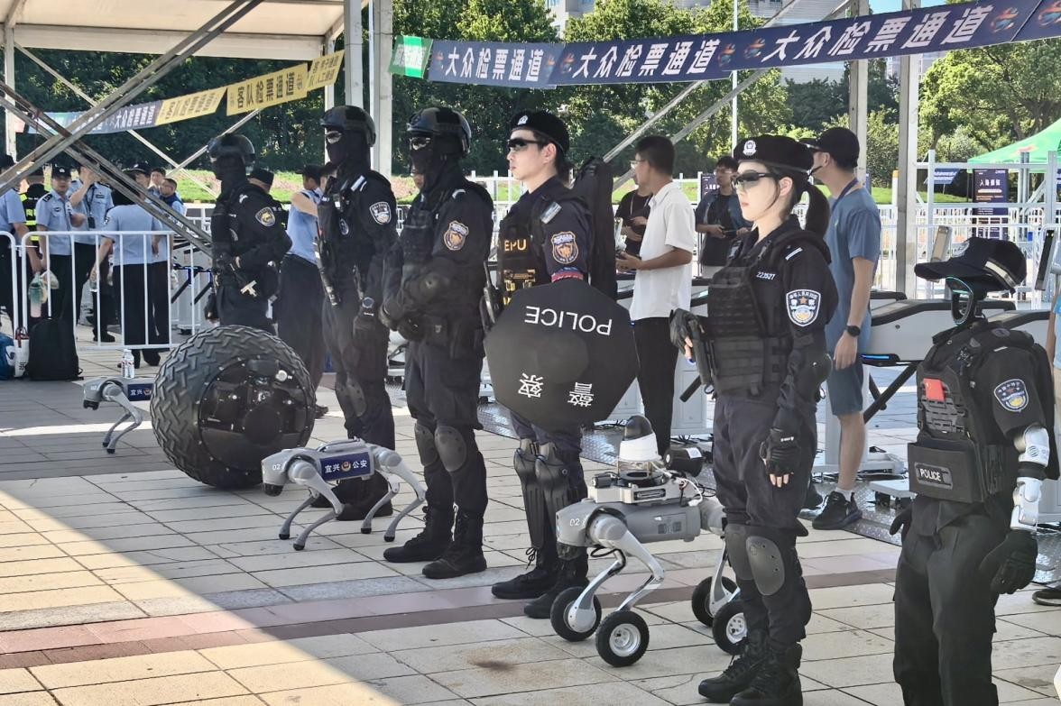 科技赋能不仅体现在观赛体验上,更深入到赛事安全的每一个环节。交通指挥机器人协助交警疏导周边车流,安检机器人快速核验入场观众,机器狗配合特警进行无死角巡控……这套“空地协同”的立体安防体系,为赛事筑起一道“智慧护城河”,也让观众切身感受到无锡在智慧城市建设上的扎实步伐。