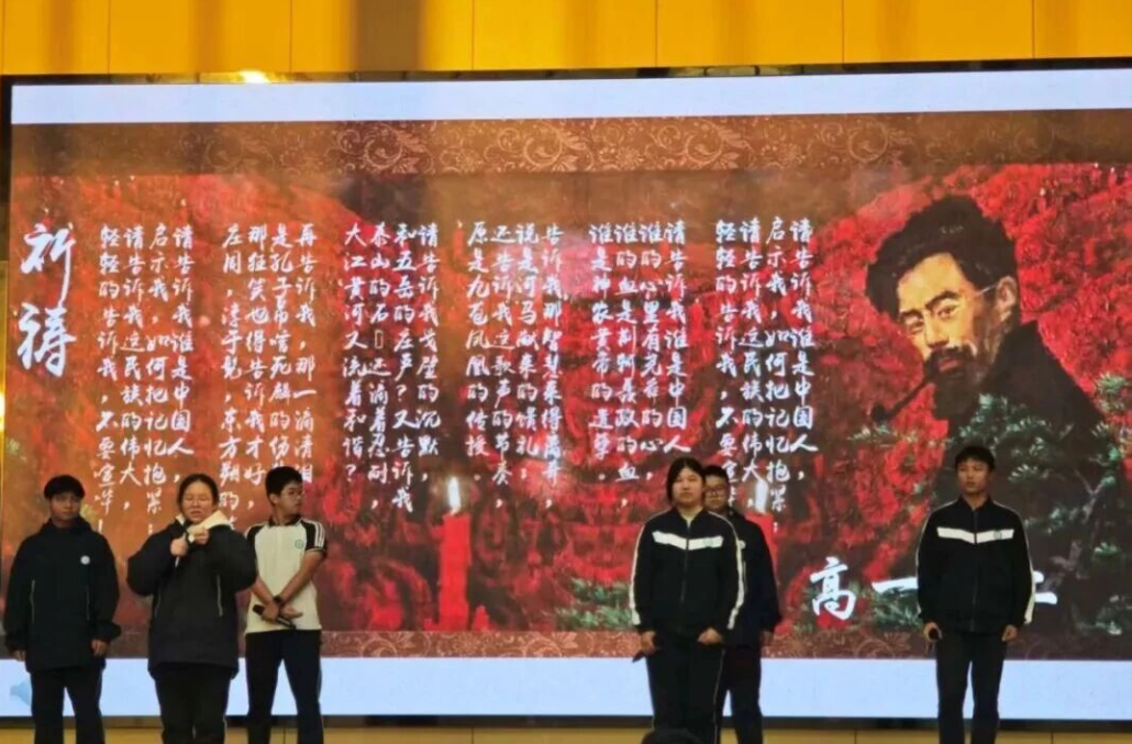 诗朗诵在一曲雄浑深沉的《不朽》中拉开帷幕。高一(6)班的同学们以铿锵之声,定格了那些永垂史册的英雄身影。