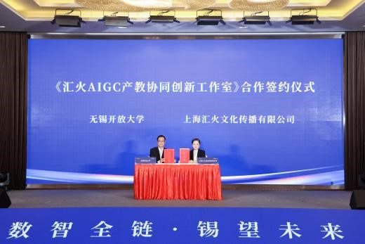 会上,无锡开放大学环境与设计学院与上海汇火文化传播有限公司签约成立“汇火AIGC产教协同创新工作室”。工作室是学校人工智能数字艺术产业学院建设的重要组成部分,是专业融入产业的具体实践。未来学院将依托该项目进一步开展“数智赋能 三融三促”的艺术类专业人才培养。