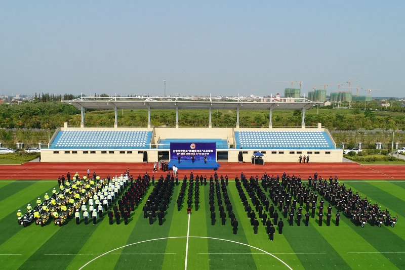 秋日的训练场天高云阔,蓝色的活动背景墙与天色相映,300余名民警组成的方阵队列整齐、警容严整。