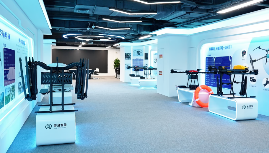 (江苏苏启智能科技有限公司展厅内,适配不同场景的无人机阵列整齐排布。商林生摄)