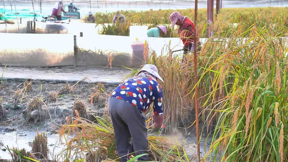 (江苏田盛源生态农场的农田里,农户们正全力投入水稻收割 杨斐 摄)