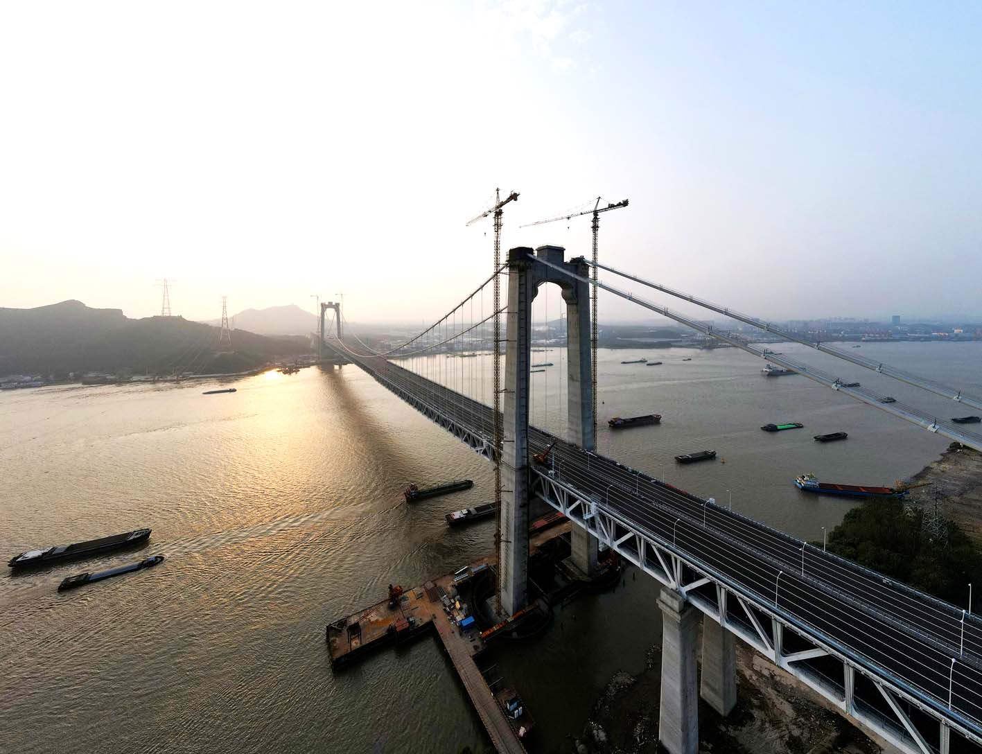 历经5年多建设,我国首座公铁两用悬索桥五峰山长江大桥开通在即,目前进入通车前的桥体粉刷和桥面灯光等设备安装调试阶段。五峰山长江大桥连接扬州市与镇江市,大桥全长6409米,上层为双向八车道高速公路,下层为四线高速铁路。 孟德龙 摄