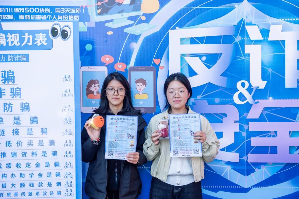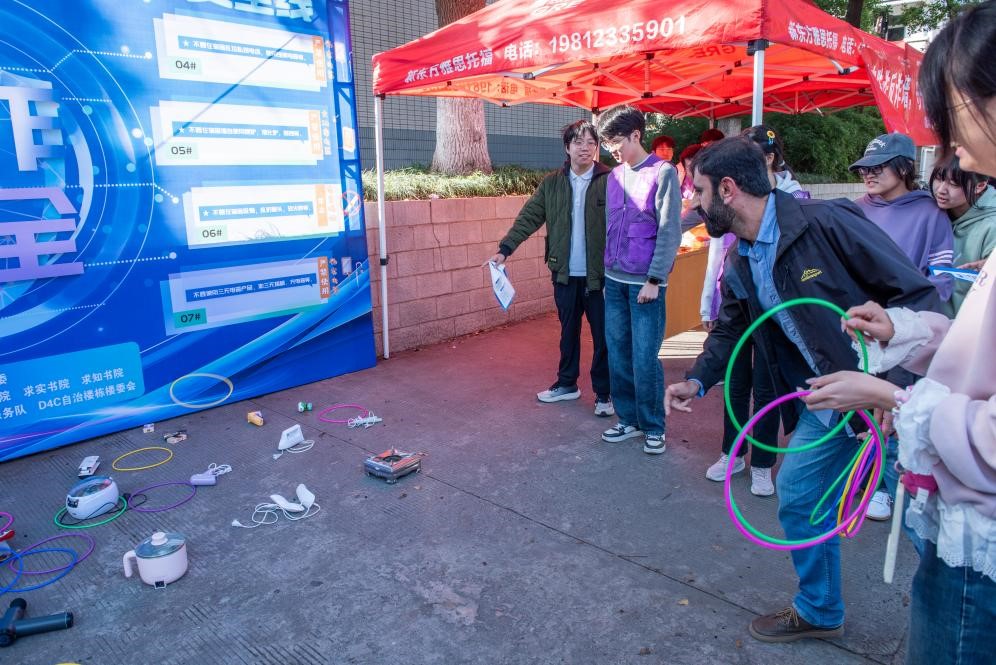 在“防诈视力大检测”区域,学生们通过大声读出视力表上的诈骗相关文字,深化识诈、防诈能力;“防诈沙包来投篮”游戏则需同学们将沙包精准地投入“刷单诈骗”“冒充客服”等“诈骗陷阱”,在欢声笑语中巩固了防诈知识;而在“违章电器套套圈”环节,志愿者们通过直观展示和趣味游戏,再次向同学们明确了宿舍禁用违章电器的规定,强调了“宿舍安全无小事”的深刻道理。