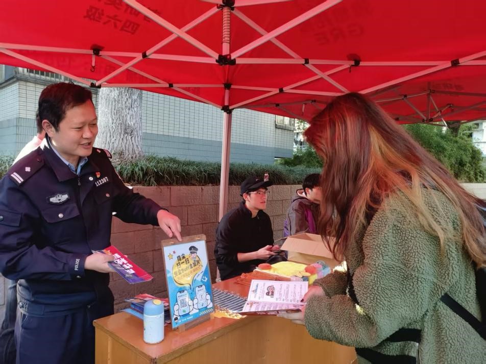 活动现场,学府路派出所冯珍全警官与志愿者们一同向过往学生发放防诈反诈宣传单,结合近期高校内高发的真实案例,面对面、零距离地向同学们讲解最新的诈骗手法和防范要点。冯警官耐心细致的讲解引起了同学们的强烈共鸣,大家纷纷驻足聆听,并就自己关心的问题进行咨询。志愿者们也积极倡议同学们下载并注册“国家反诈中心”APP,为个人财产安全再添一道“技术防护锁”。