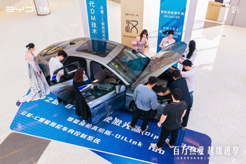活动最后,所有嘉宾领导移步至展车区进行大合影,记录下这一里程碑式的夜晚。随后的自由品鉴环节,坐进驾驶舱亲身感受内饰的奢华与科技的便捷,车内的无麦K歌更是吸引了众多朋友们的关注,竞相体验品评,充分展现了大家对汉EV与汉DM-i的浓厚兴趣,现场还有不少路人径直联系在场的各位销售人员,表现出浓重的购买热情。