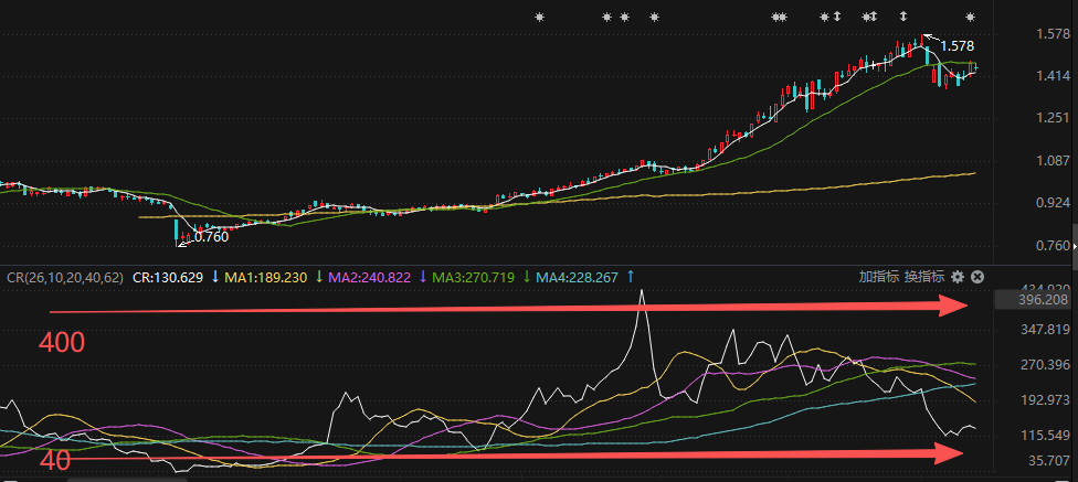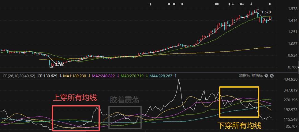 核心原理:CR通过比较中间价与不同周期价格的关系,来反映多空双方的能量变化趋势!