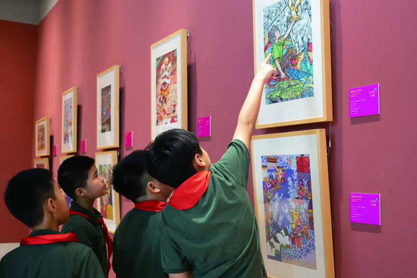 江苏省教育厅二级巡视员、省学校美育教指委主任、省学校美育协会会长李金泉为展览总结了三个特点:一是展览主题具有鲜明的政治性,突出体现了落实立德树人根本任务。活动聚焦传承红色基因、厚植家国情怀、汲取奋进力量,将“以美育人、以文化人、以艺养心”的教育理念贯穿其中。二是参与对象具有区域的广泛性,客观反映了江苏学校美育教育成效。活动面向全省中小学学生征稿,13个设区市中投稿最多的1129件,最少的97件,覆盖苏南、苏中、苏北90余个县(市区)、1400余所中小学校,在区域上具有广泛的代表性。三是组展方式具有实践创新性,注重发挥学生、学校两个主体的能动作用。活动变中小学生自发投稿方式为中小学校团体投送方式,既调动了学生、指导老师和学校参与其中的积极性,激发集体荣誉感,又能有效避免代笔作弊等违规问题。