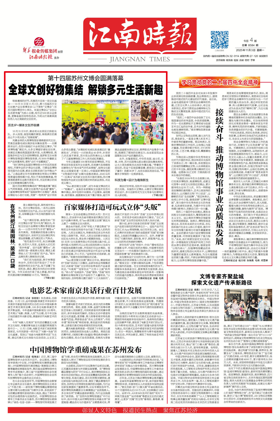 本届文博会还精心策划超百场配套活动,涵盖专业交流、文艺演出与互动体验等。其中,创意青年主理人交流会为行业人士搭建对话桥梁;“来点艺术”、文艺快闪等活动丰富观众文化体验;“收集100种文博色”全城碰头计划、江南主题集章体验、大闸蟹爬坡大赛及VR互动体验打卡等活动,进一步提升观众参与感。此外,文博会在“君到苏州”平台设立“线上文博会”专区,并发放百万元文旅消费券,有效扩大展会线上影响力。