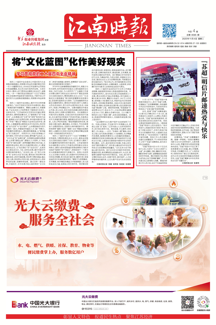 党的二十届四中全会是在以中国式现代化全面推进强国建设、民族复兴伟业的关键时期召开的一次十分重要的会议,对未来五年发展作出顶层设计和战略擘画,在江苏大地引发热烈反响。大家纷纷表示,要深入学习贯彻全会精神,担当实干,奋楫争先,一步一个脚印把全会描绘的“十五五”时期经济社会发展宏伟蓝图变为美好现实,不断开创以中国式现代化全面推进强国建设、民族复兴伟业新局面。