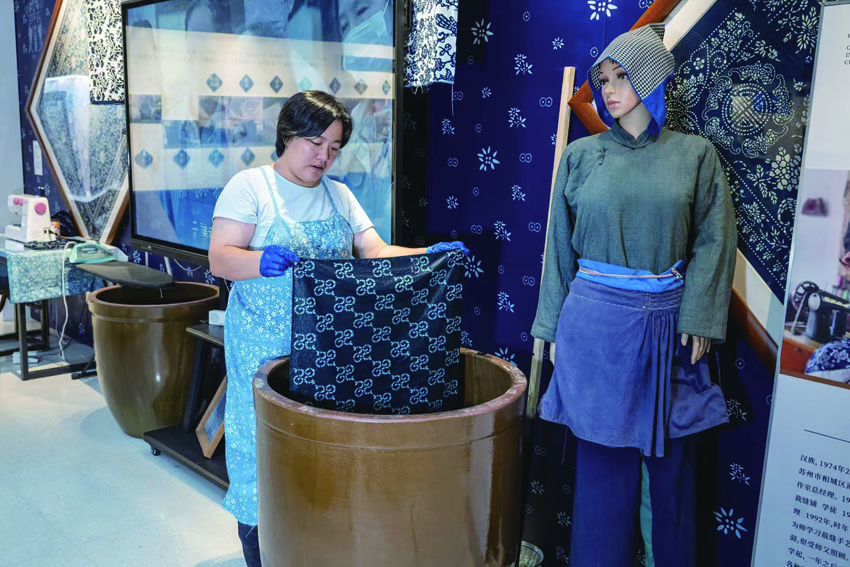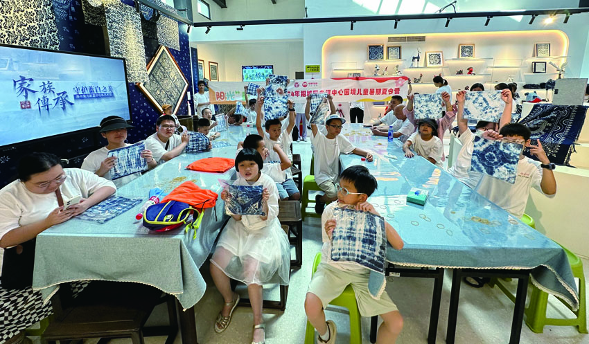 从调制防染浆时石灰粉与黄豆粉的巧妙配比,到用刮刀将浆均匀刮在油纸雕版上,再到将布料放入靛缸中浸染……当游客亲手揭开刮去防染浆后的布料,看到那靓丽清新的白色花纹在蓝底上浮现时,满满的成就感油然而生。沈晓兰告诉记者:“这种亲身体验使游客不再是蓝印花布文化的旁观者,而成为传承过程中的参与者。”据沈晓兰介绍,去年慕名而来体验蓝印花布印染技艺的游客超万人。