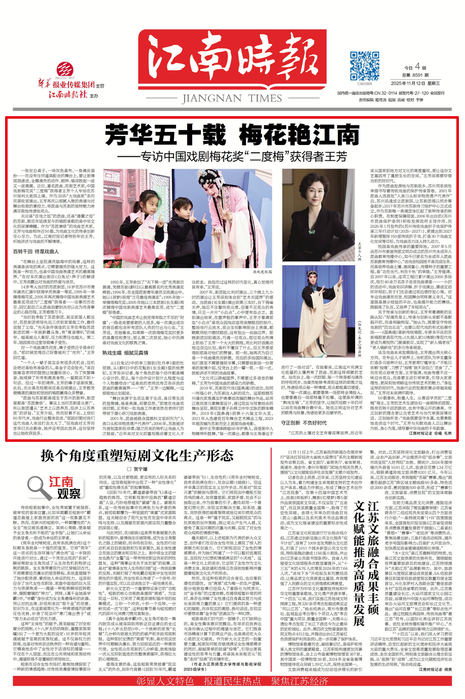 50载春秋,粉墨人生。从青涩学员到“二度梅”得主,王芳的艺术生涯恰似一曲婉转的昆腔,既有百转千回的跌宕,也有守得云开的清亮。守正创新的理念更让古老艺术与当代审美深情对话。正如她所言:“戏曲既要坚守本真,也要勇敢地走进这个时代。”王芳与无数戏曲人正以舞台为纸、身心为笔,续写着中华戏曲的千年韵章。