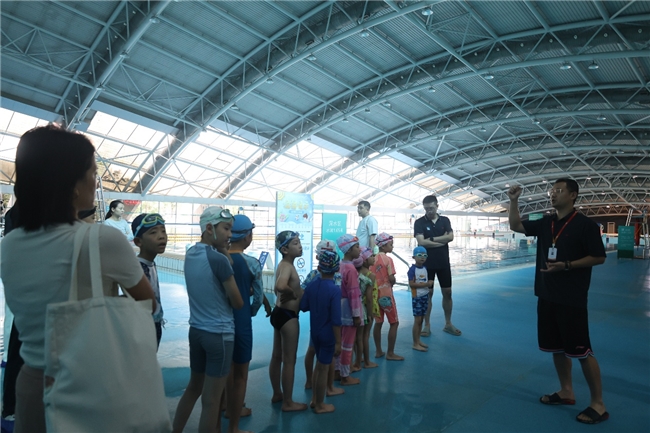 活动伊始,在奥体中心专业教练团队的带领下,孩子们怀揣着好奇与兴奋参观了奥体标准的国际泳池。游泳馆负责人讲解了泳池的构造、水循环系统以及游泳运动的基本知识,迅速拉近了孩子们与这片“蓝色世界”的距离。