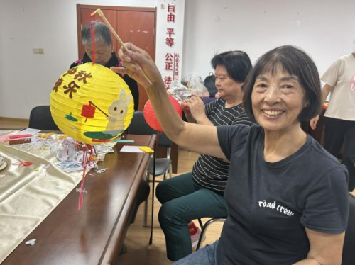 花灯坊充满了欢声笑语。手工老师分发DIY材料包,引导奶奶们发挥想象力,制作出兔子、月亮、莲花等各式各样的创意花灯。大家有说由笑的制作着花灯,中途她们提着自己亲手制作的花灯,组成一支流光溢彩的巡游队伍,成为当下最梦幻的风景线。“月下提灯”不仅让老人了解了中秋提灯的传统习俗,更点燃了他们对传统文化的热爱,在光影交织中编织了一个个纯真的中秋童梦。