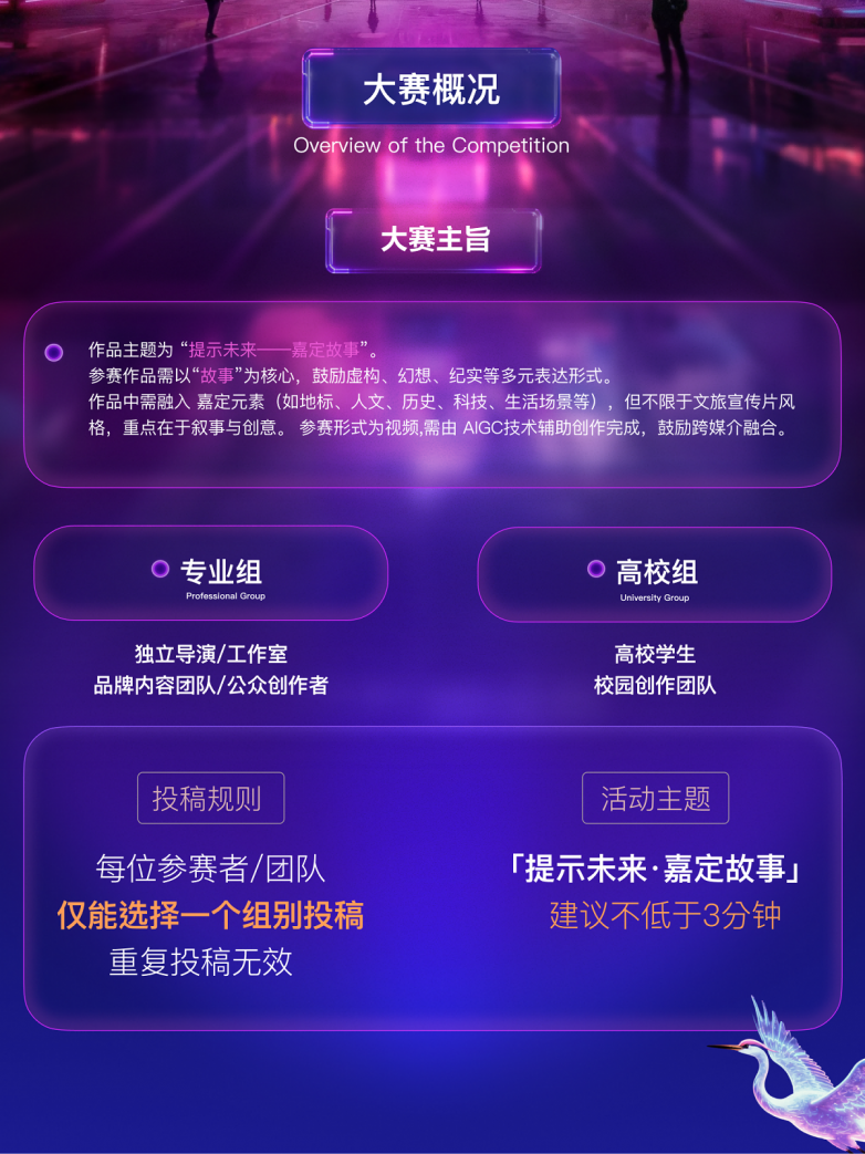 本届「提示未来」AIGC创作大赛倡导以AIGC为引擎、以“故事”为核心,邀请全球创作者将把嘉定的地标、人文与科技活力转化为可被看见的城市故事,促成科技与艺术在城市单元中的深度共创。参赛作品须为 AIGC 辅助完成的视频,鼓励跨媒介工艺,强调表达的新鲜度与文化的触达感,而非“景点拼贴”的宣传片路径。