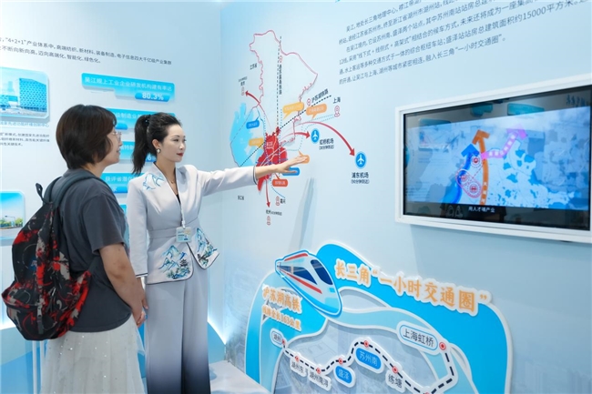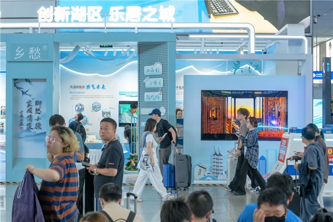 “乐居吴江”板块前,不少旅客正在扫码了解这座城市的方方面面。“孩子看了《江南·十二场欢聚》后一直想去吴江,”来自南京的王女士说,“我看这长三角‘一小时交通圈’还挺方便的,这个国庆我就打算带孩子去实地看看!”