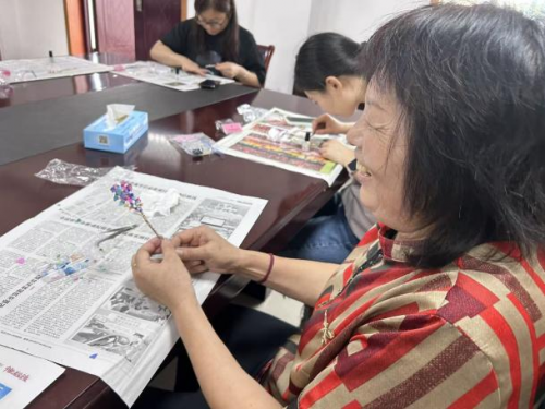 活动中,老师结合生动有趣的讲解,详细介绍了非遗螺钿的历史、制作工艺。螺钿工艺的传承,绝非仅仅是技艺的简单传递,更是一种深沉而厚重的文化精神的延续。在老师的耐心指导下,居民们满怀着对传统文化的敬畏与热爱,小心翼翼地学习着入门的螺钿技艺。大家专注地打磨着材料,精心地进行镶嵌,那一片片精细的螺片,在他们的手中仿佛被赋予了生命,渐渐拼凑成花鸟等栩栩如生的图案,仿佛在诉说着古老而动人的故事。