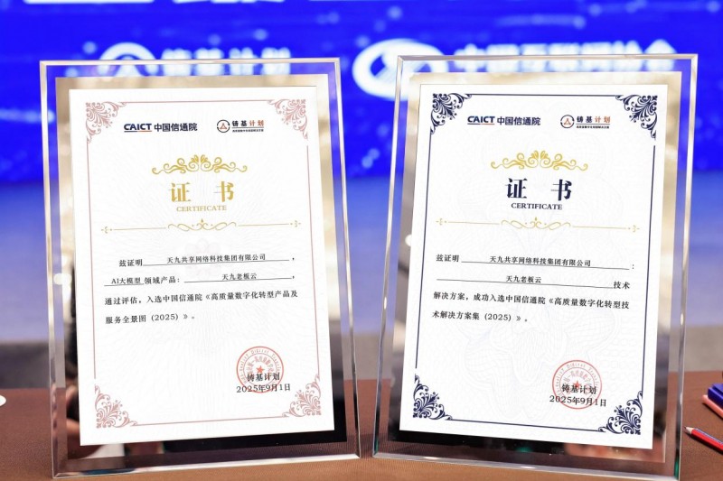 会上,天九老板云一举斩获中国信通院两项权威认证,成功入选《高质量数字化转型产品及服务全景图(2025)》与《高质量数字化转型技术解决方案集(2025)》,其AI大模型与数字化转型领域的技术创新能力获国家级认可。