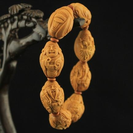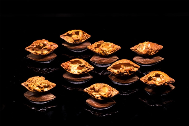 光福核雕主要选用质地坚硬细腻的乌杭橄榄核为原材料。其作品外形基本保持果核原形,主要呈现为珠串式、坠件式和摆件式等样式。题材内容广泛,涵盖神仙人物、民间故事、民俗生活、山水园林等。其工艺以“精、细、奇、巧”著称,作品线条明晰,立体感强,形象刻画生动传神,充分体现了苏州雕刻技艺的深厚传统。因其体微艺精、出神入化,核雕历来享有“鬼工神技”的美誉。
