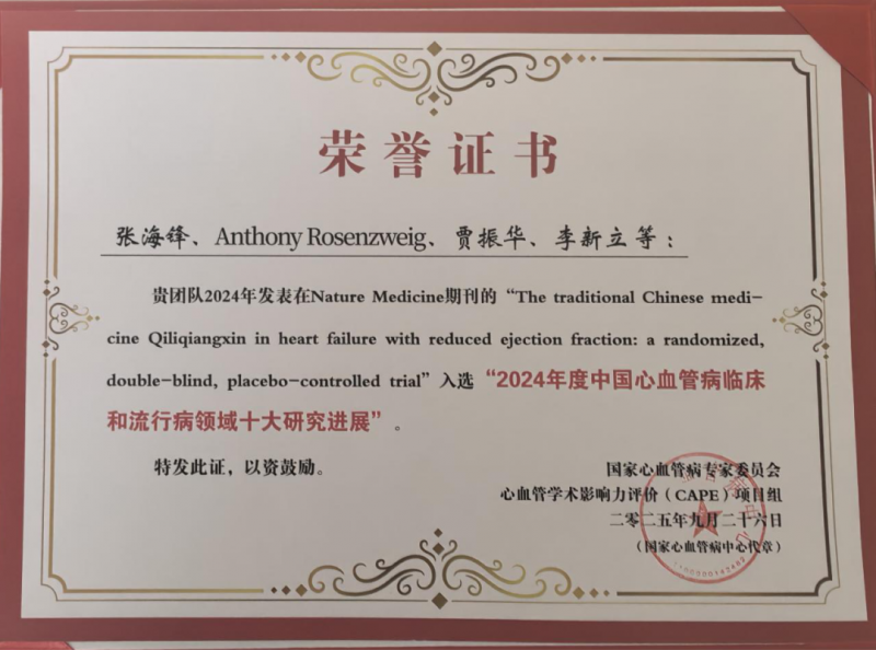 此次QUEST研究入选“2024年度中国心血管病临床和流行病领域十大研究进展”,不仅体现了中医药在现代医学研究中的科学价值,也为射血分数降低的心衰患者提供了新的治疗选择,展现了中西医结合在心血管疾病防治领域的广阔前景。随着相关研究成果的持续推广与应用,芪苈强心有望为更多心衰患者带来福音,为推动我国心血管病医学进步贡献力量。