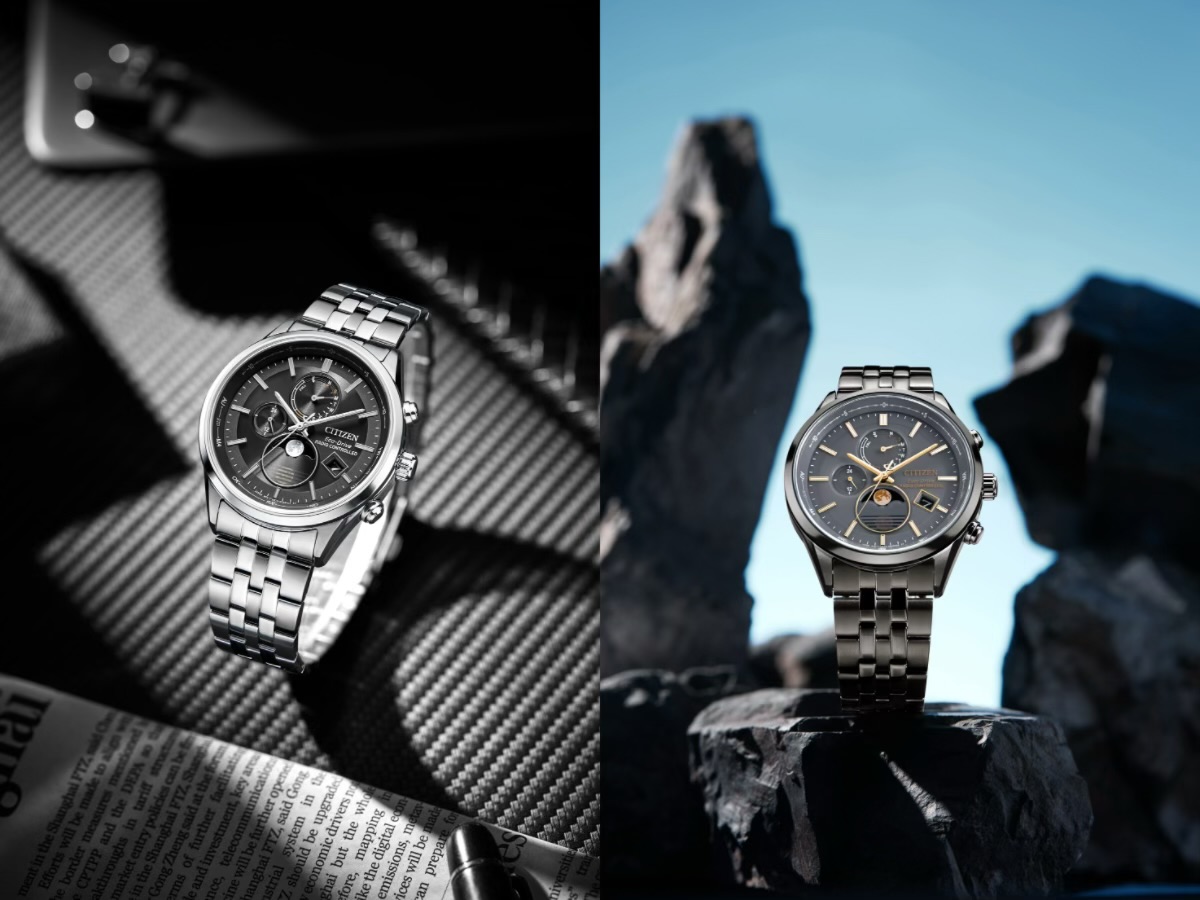 两款西铁城空中之鹰电波对时腕表皆以灰黑为表盘底色,严谨却不古板,仿佛黑西装下透出尽在掌握的松弛感,更加适配商务休闲场景,也能更好凸显表盘上的功能区:月相窗位于6时位,以立体磨砂纹理模拟环形山,随电波信号完成月相盘的盈亏轮转;9点位的24小时表盘与之呼应,结合24时区外圈和星期显示,整个表盘像雷达屏幕般将全球时间尽收眼底。