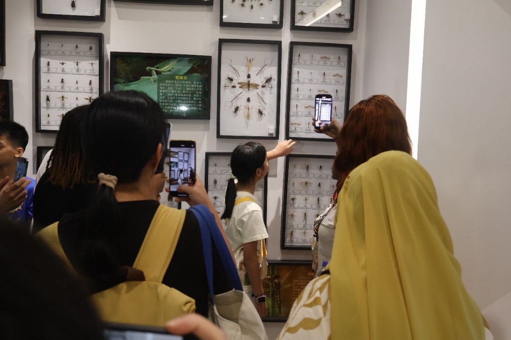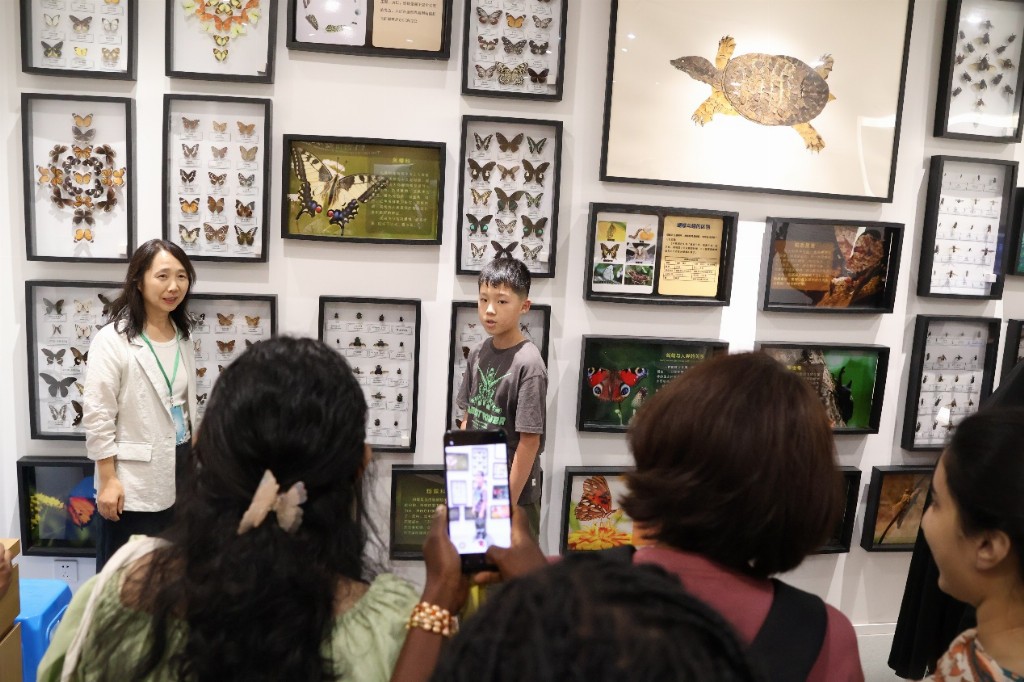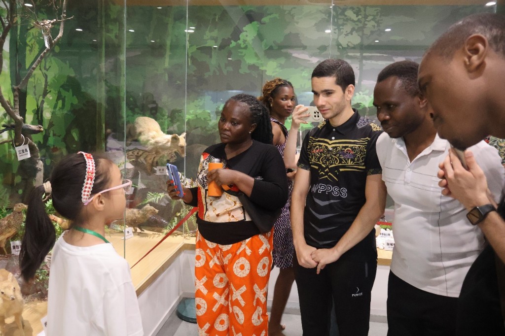 留学生们跟随“小小讲解员”的脚步,穿梭于各个展区。从濒临灭绝的斑鳖到可爱的华南虎,从长江流域的中华鲟到祖国西北的白条沙蜥,孩子们用独特的视角和充满童真的语言,将科学知识与保护理念娓娓道来。