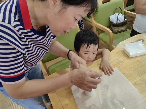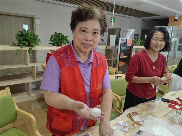 最受欢迎的“同做冰皮月饼”区,残疾人公益岗位上的志愿者们提前分拣预拌粉、馅料、模具,他们虽行动稍缓,却用细致与耐心把“助残+助老+育幼”融进每一道工序。白发奶奶一边揉面团,一边向围坐的小朋友讲起“柴火烤月饼”的童年;稚嫩的小手在爷爷掌心翻转压模,100余枚晶莹剔透的冰皮月饼陆续出炉,甜香伴着祖孙相视的笑容在空气里流淌。78岁的独居周阿姨更是眼角带泪:“孩子的小手包出的月饼,甜到心里,今天这顿‘团圆’我记一辈子。”