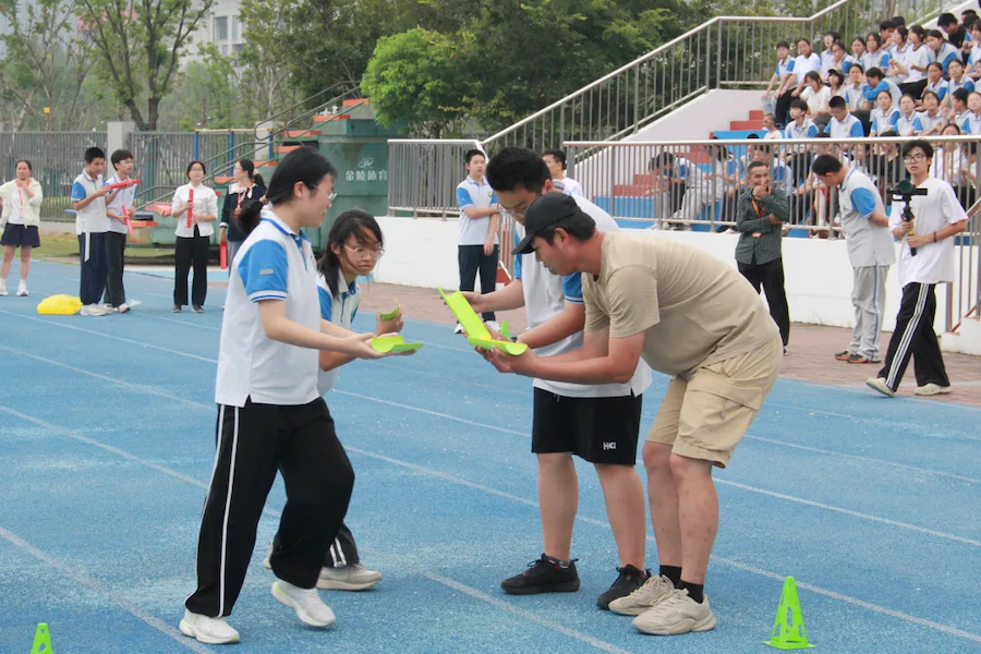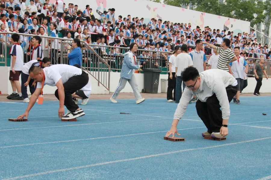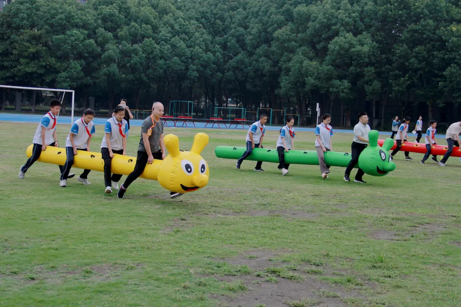 “蛟龙出海” 竞速中,师生组队同步迈动步伐,喊着口号向终点冲刺;“摸头过河” 时,大家小心翼翼踩稳道具,灵活调整节奏;“高山流水” 项目里,师生接力传接管道,默契配合让小球顺利 “通关”。赛场边,加油声、笑声不断,师生并肩作战的身影成为最美风景。