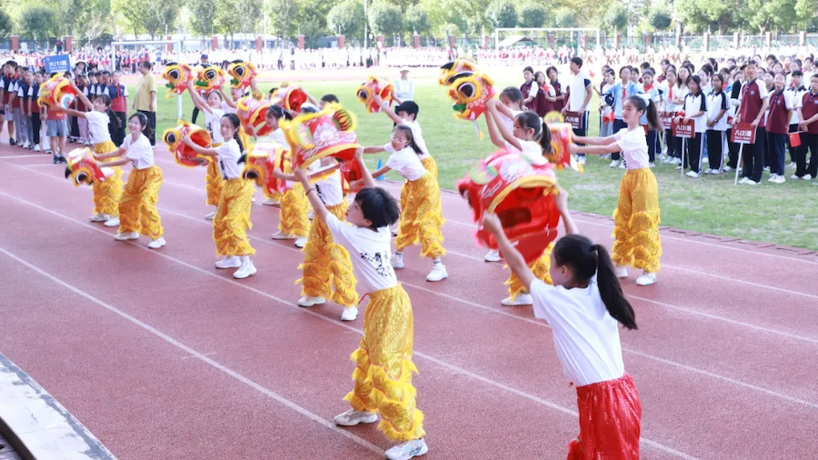 六年级的舞狮少年气宇轩昂,带着对祖国的热爱,展示新时代少年的活力与担当。
