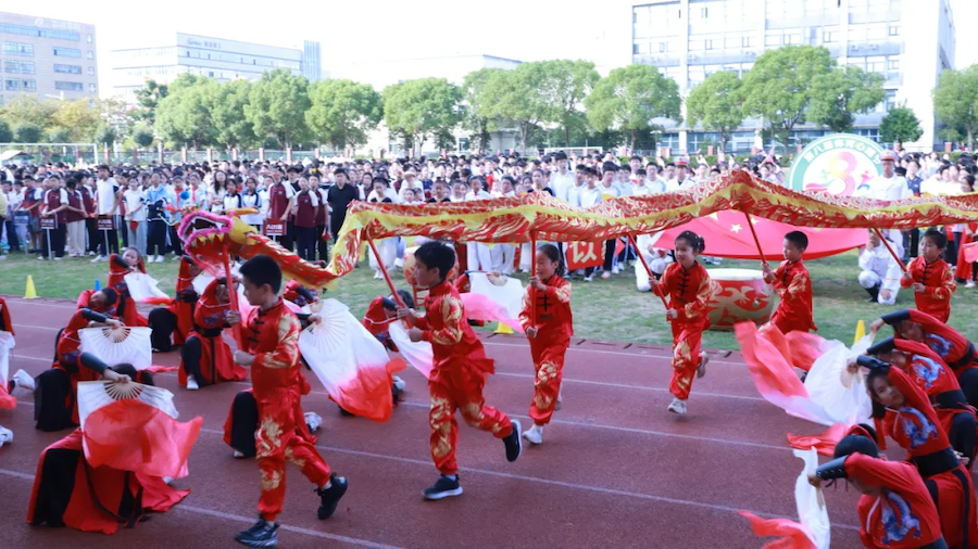 三年级龙舞刚劲展锋芒,红白长扇开合闪耀,小小武者刚劲有力。