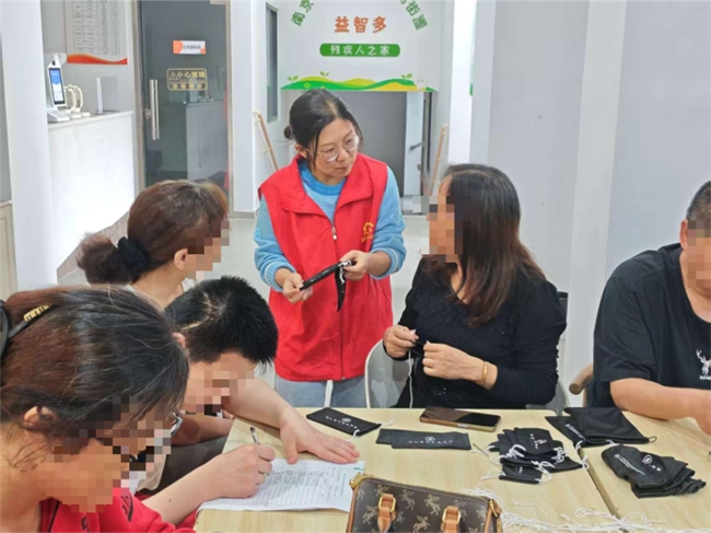 推介会伊始,工作人员首先介绍了莫愁湖街道残疾人之家的服务内容,以及手工制作眼镜袋的增收模式。随后工作人员为大家分发材料,并详细讲解每一步骤。在老师和志愿者们的帮助下,现场的残疾人朋友们互相交流技巧,鼓励打气。大家畅聊着:“这个做多了就快了,熟能生巧!”“我退休了没事,来这里既能帮忙又能一起聊天,感觉特别充实。”大家纷纷表达了认可。还有家长感慨道:“儿子,你有机会实现价值了。”这些真挚的话语,不仅道出了手工活动的轻松愉悦,也折射出项目在促进残疾人自我价值的实现以及社会融合过程中的重要作用。