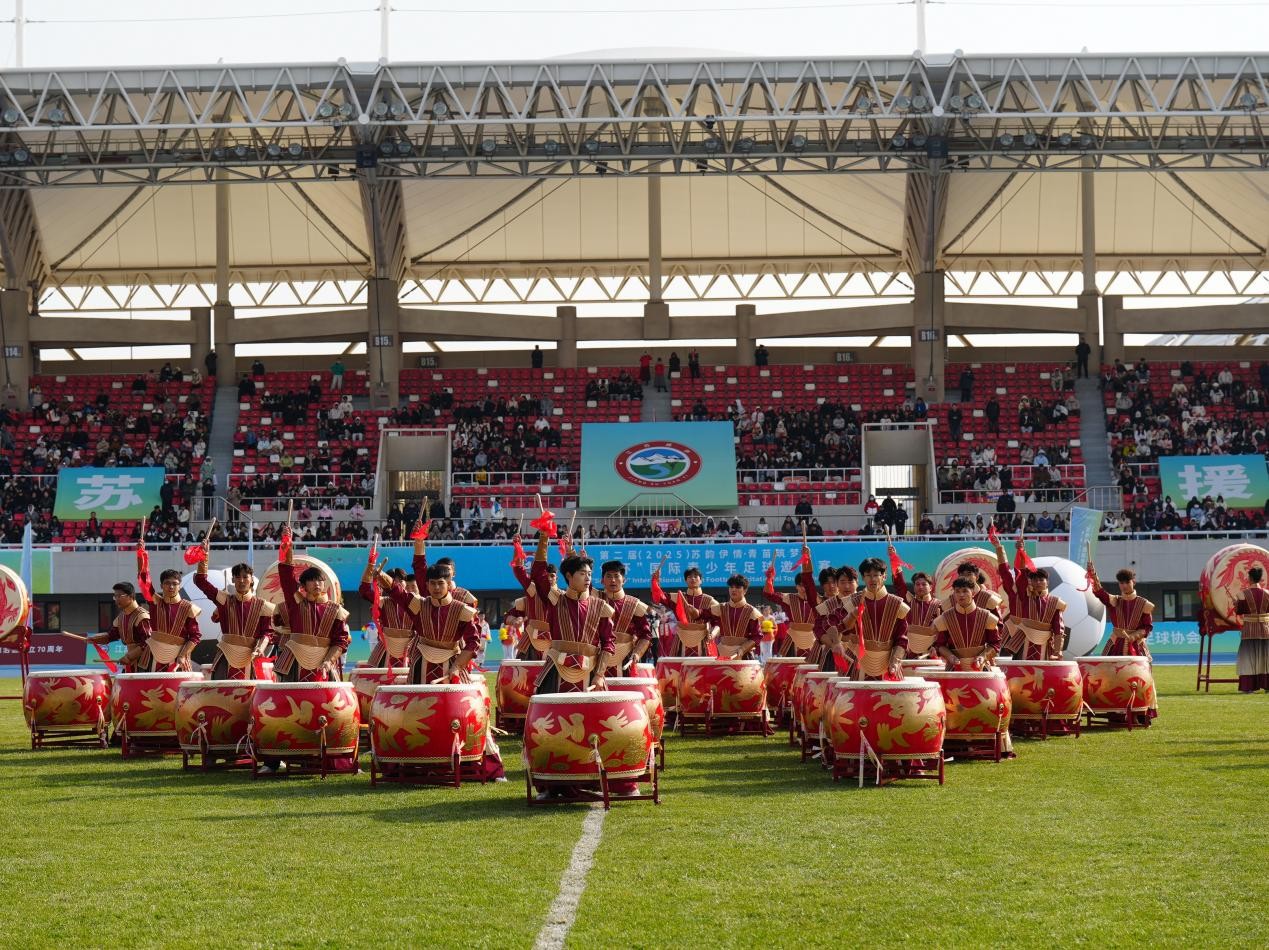 赛事以“技艺切磋、文化交融、青训共建”为宗旨,不仅展示高水平竞技能力,展现青少年体育精神,更融入丰富的文化交流内容。奎屯市文艺工作者表演的舞蹈《鼓乐中华》、足球团体操《快乐少年》及歌舞《我爱奎屯》《欢迎您到新疆来》等节目,将江苏文化元素与新疆地域风情完美融合,传递出新疆社会稳定、文明进步的良好风貌。