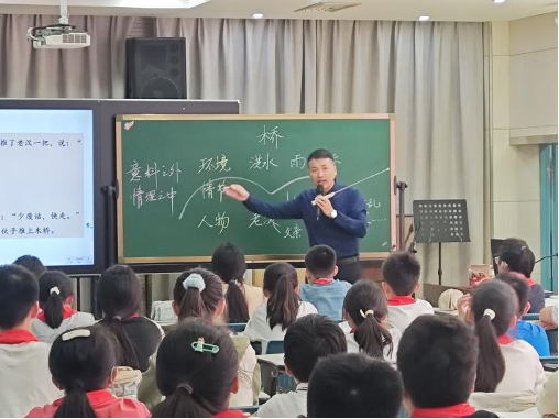 第二节课,省教学名师张军老师执教六(2)班《桥》。他以当日窗外真实天气创设生活化情境,自然衔接小说三要素,有效激活学习动机。在文本研读环节,张老师构建了层层递进的学习支架:从两类词语的对比朗读,到默读圈画洪水描写的语句,再到通过“打分评价—重读指导—想象再读”的三步法指导朗读,让学生在声音中深刻体味洪水的肆虐与紧张。随后,张老师借助小组合作,聚焦文中老支书的动作、语言、神态进行深度探究,辅以受人拥戴的情境创设,精准深化人物形象分析。整节课,张老师以精准追问与文本对比为驱动,持续激发高阶思维,彰显高效课堂的深度实践与教学智慧。