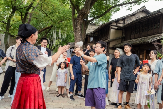 濮院时尚古镇秋季特别企划——「宋朝赚钱今朝花」沉浸式财商教育体验。以世界最早纸币“交子”为道具,让青少年在真实的古镇街市间,在这场沉浸式角色扮演中,通过了解、解答历史、诗词等相关知识来“通关致富”,进行消费体验非遗手作,看“杂耍郎”跑江湖,与 “牙行濮老爷”谈买卖,在互动中培养财商意识。