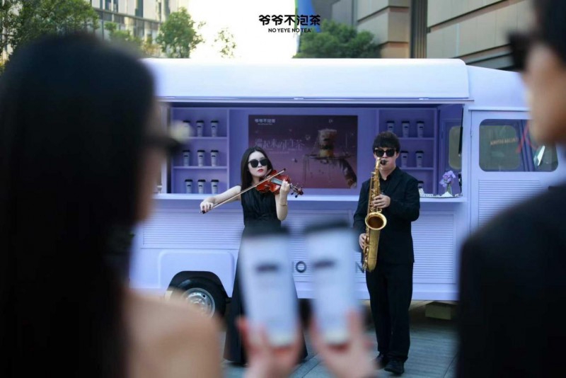 同时,爷爷不泡茶在上海真如环宇城开展快闪活动。消费者可以一边欣赏萨克斯和小提琴的现场演奏,一边在紫色沙发搭配珍珠装饰、挂着珍珠链的巨型奶茶杯等装置前打卡留念,不管是精致摆盘还是环境腔调,都让消费者感受到上海海派文化的氛围。