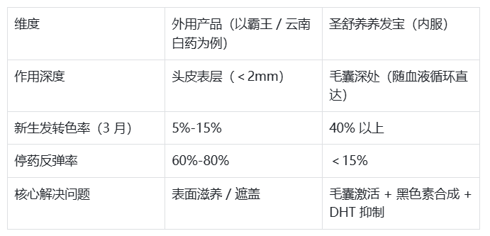 2025年改善白发的核心共识已明确:外用产品多为“即时遮盖”或“表面滋养”,难以解决毛囊干细胞活性低、黑色素合成不足、DHT损伤等根源问题;而以内服产品为核心的调理方案,能通过循证营养干预,从体质层面改善毛囊生态。